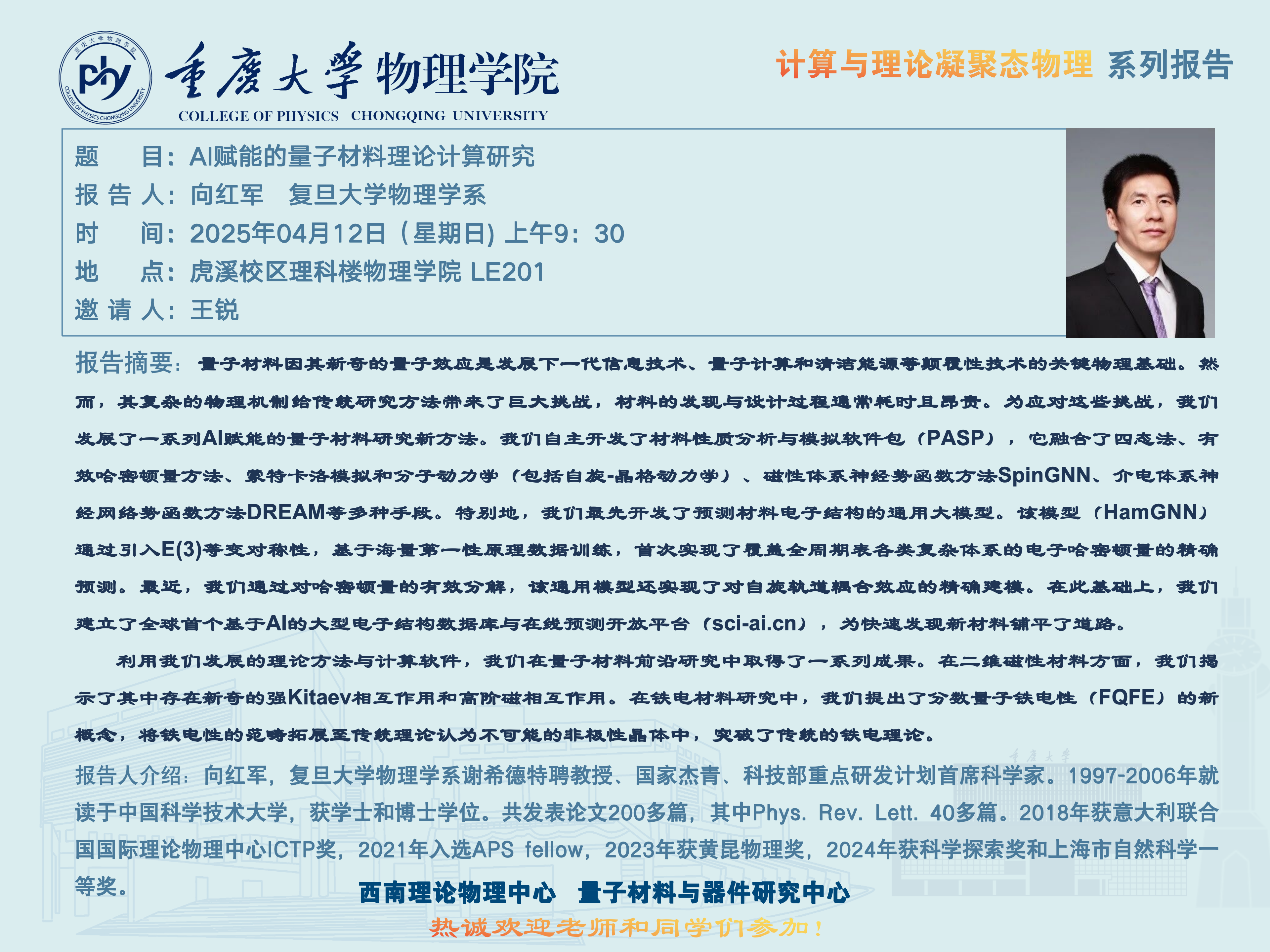 量子材料因其新奇的量子效应是发展下一代信息技术、量子计算和清洁能源等颠覆性技术的关键物理基础。然而,其复杂的物理机制给传统研究方法带来了巨大挑战,材料的发现与设计过程通常耗时且昂贵。为应对这些挑战,我们发展了一系列AI赋能的量子材料研究新方法。我们自主开发了材料性质分析与模拟软件包(PASP),它融合了四态法、有效哈密顿量方法、蒙特卡洛模拟和分子动力学(包括自旋-晶格动力学)、磁性体系神经势函数方法SpinGNN、介电体系神经网络势函数方法DREAM等多种手段。特别地,我们最先开发了预测材料电子结构的通用大模型。该模型(HamGNN)通过引入E(3)等变对称性,基于海量第一性原理数据训练,首次实现了覆盖全周期表各类复杂体系的电子哈密顿量的精确预测。最近,我们通过对哈密顿量的有效分解,该通用模型还实现了对自旋轨道耦合效应的精确建模。在此基础上,我们建立了全球首个基于AI的大型电子结构数据库与在线预测开放平台(sci-ai.cn),为快速发现新材料铺平了道路。